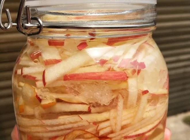 5.瓶口封上保鮮膜,蓋上蓋子,在較溫暖處呆上三個月以上,那時蘋果全部呈黃褐色且干枯狀浮于醋中,而醋卻呈現(xiàn)清亮的金黃色時,即可開蓋享用。