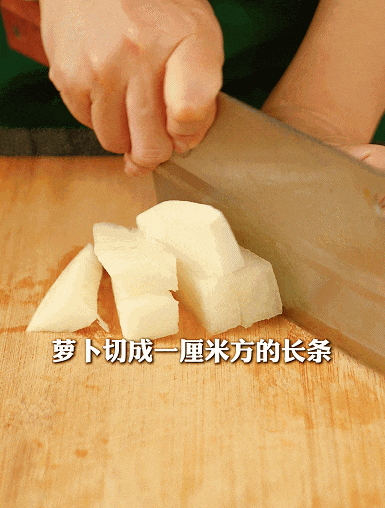 1.蘿卜先切成1厘米方的長條,蘿卜1500克,鹽60克,加比平時做菜多一倍的鹽,腌1個小時,去掉蘿卜的辛辣味。